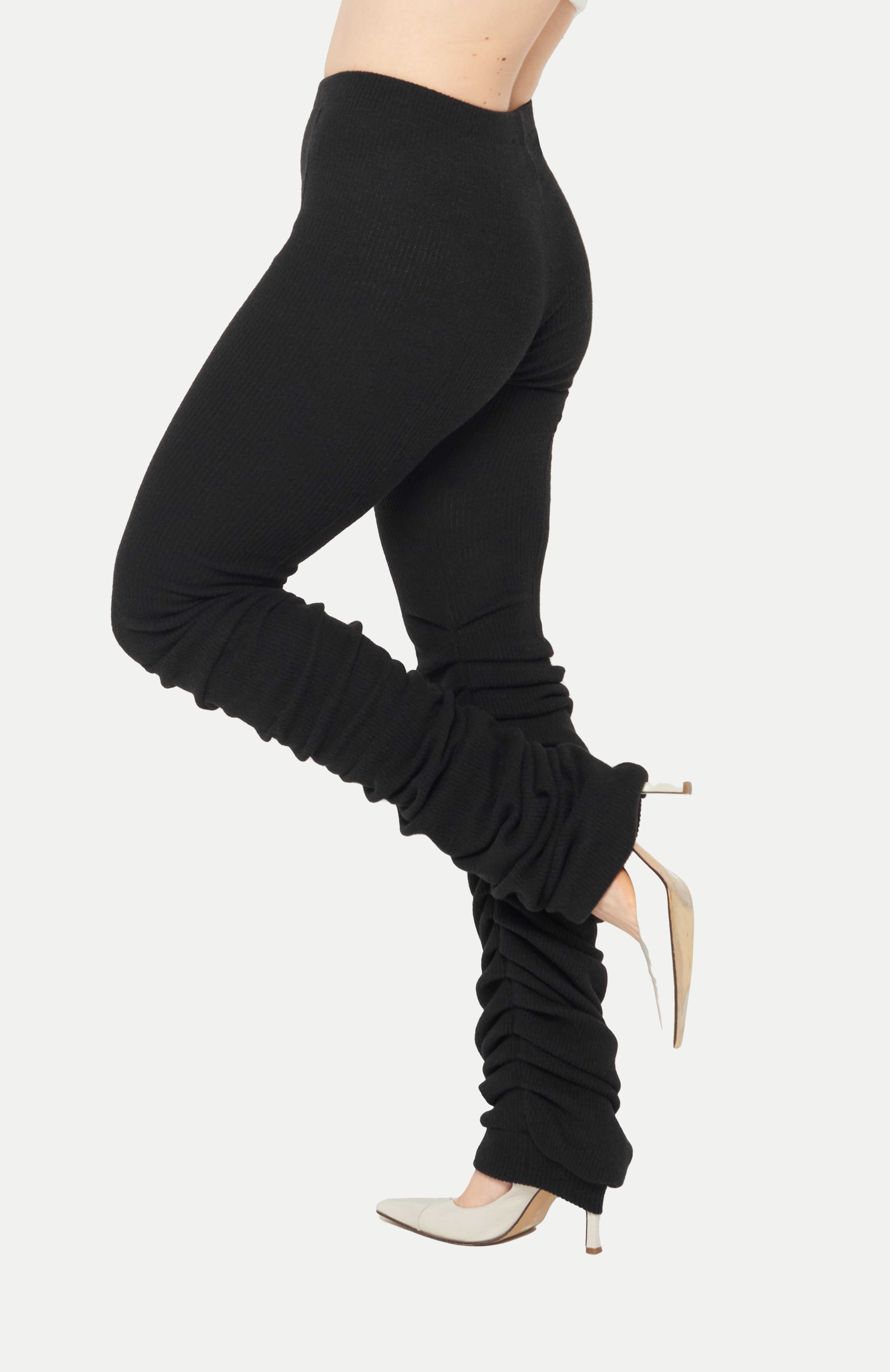 High rise wool blend warm-up black leggings. A pleated inseam starts from the knee for a lamb leg effect, gathering around the hem of the foot. Flattering pin tucks run along the front and back of both legs giving you visual cues to correct your lines in the mirror.