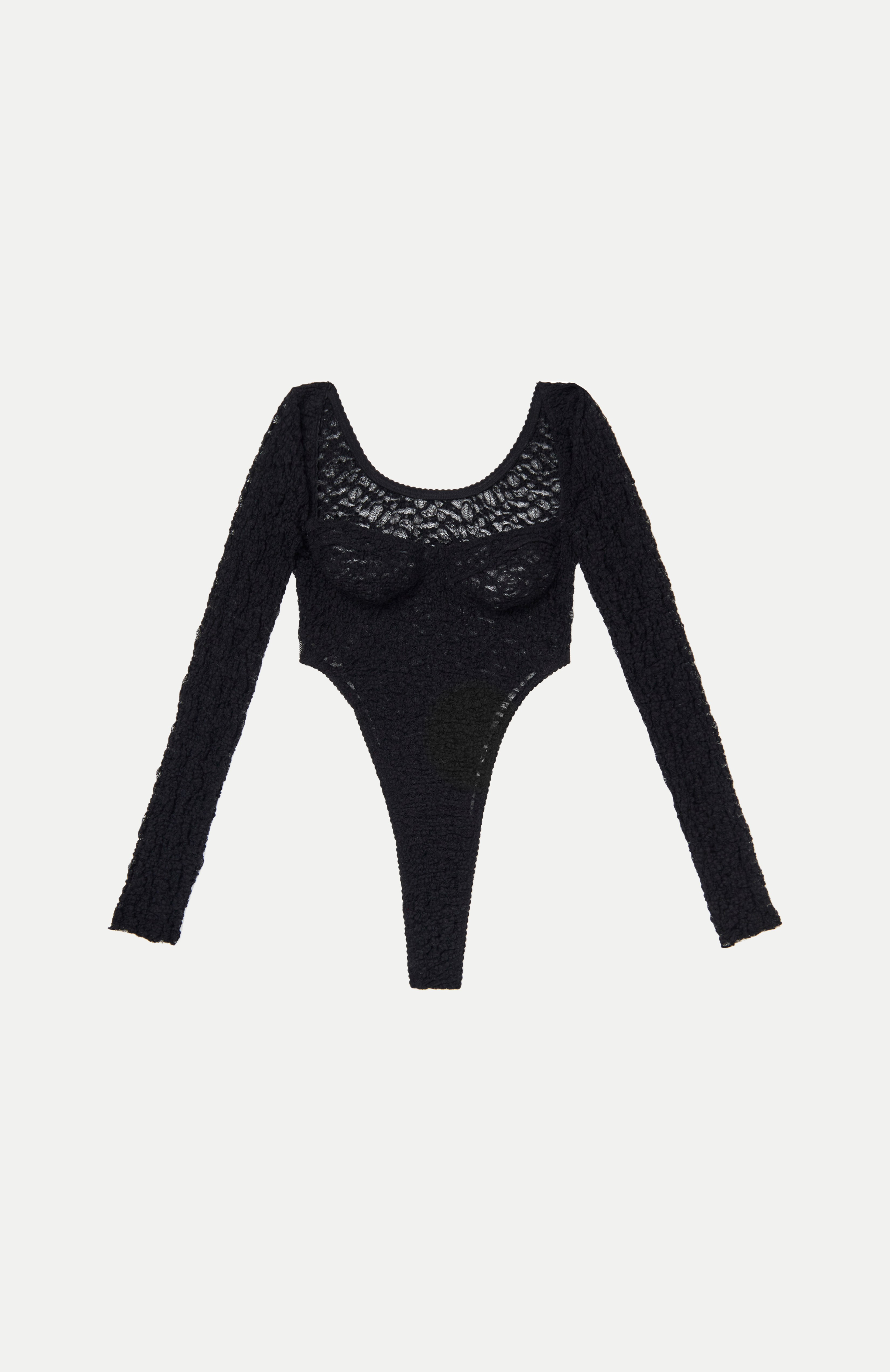 A reprise of our signature high cut Geotard in black lace. Features, zig-zag decorative stitching on a scalloped black elastic and a fully lined gusset.