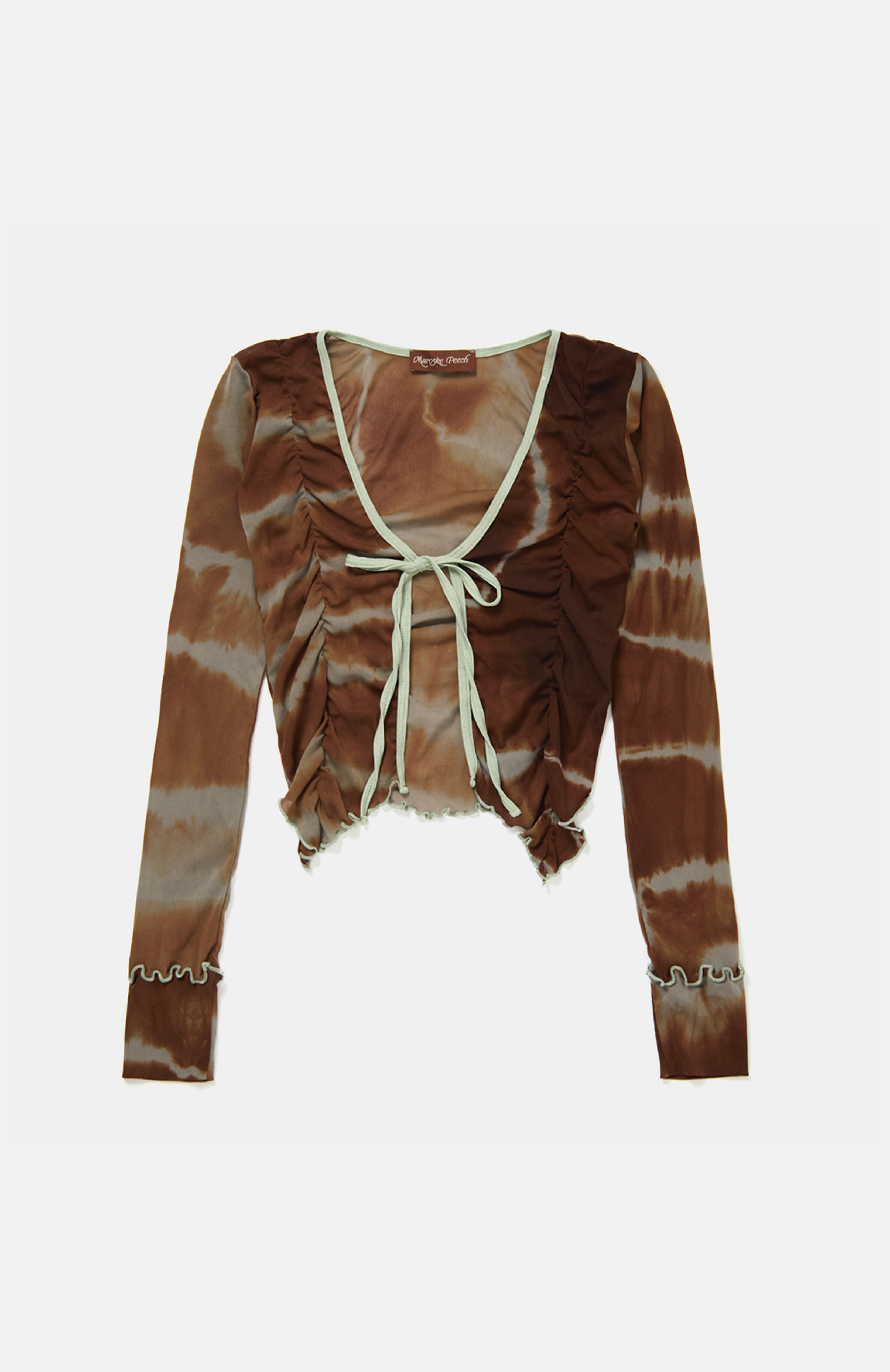 Maroske Peech Womans dune brown mint hand tie dyed tie up mesh long sleeved butterfly tie dye  babylock blouse