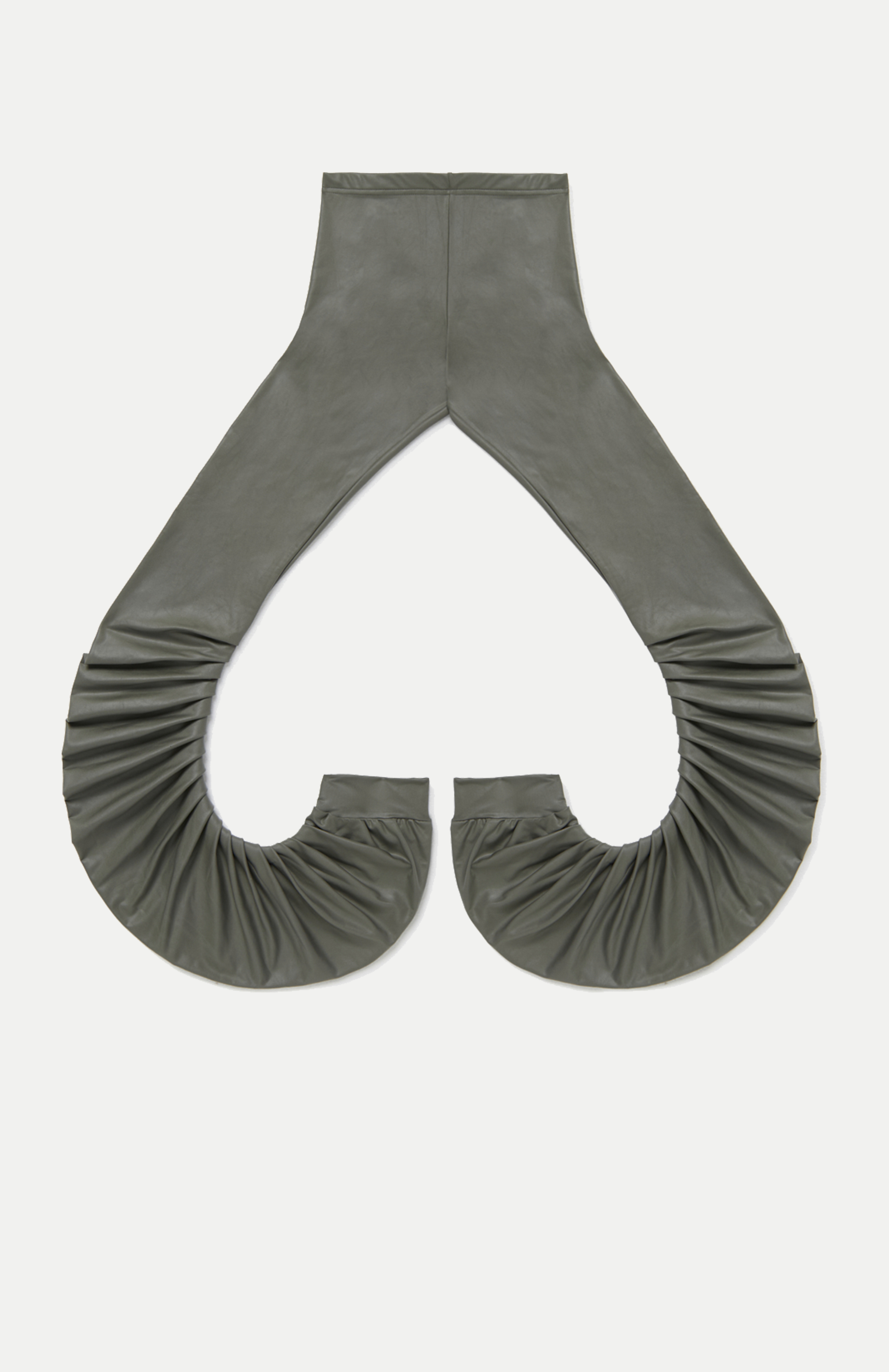 High rise iron coloured wet look leggings with a pleated inseam. Volume starts from the knee and drapes down over the foot for a lamb leg effect.