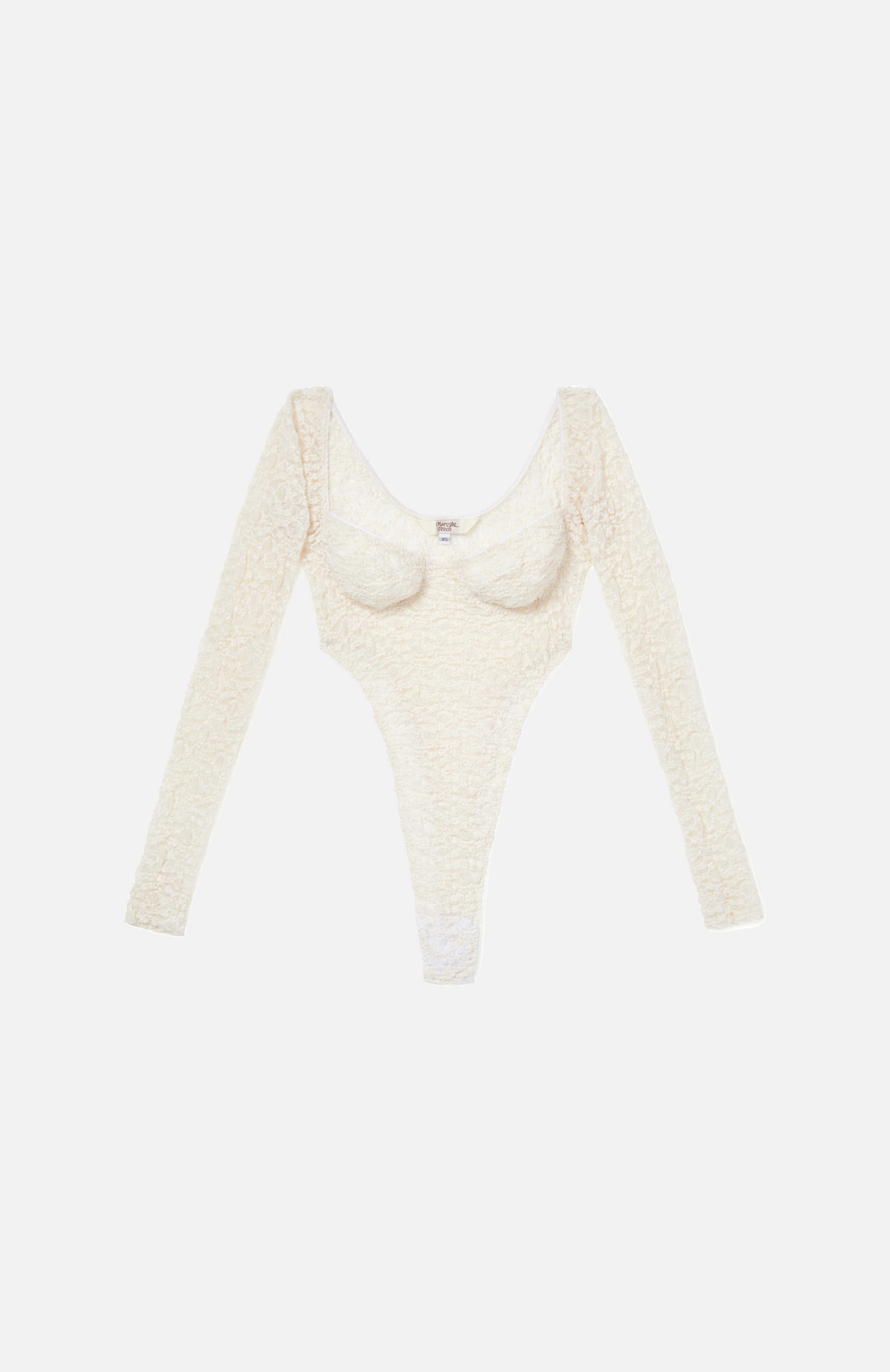 A reprise of our signature high cut Geotard in ivory lace. Features, zig-zag decorative stitching on a scalloped white elastic and a fully lined gusset.