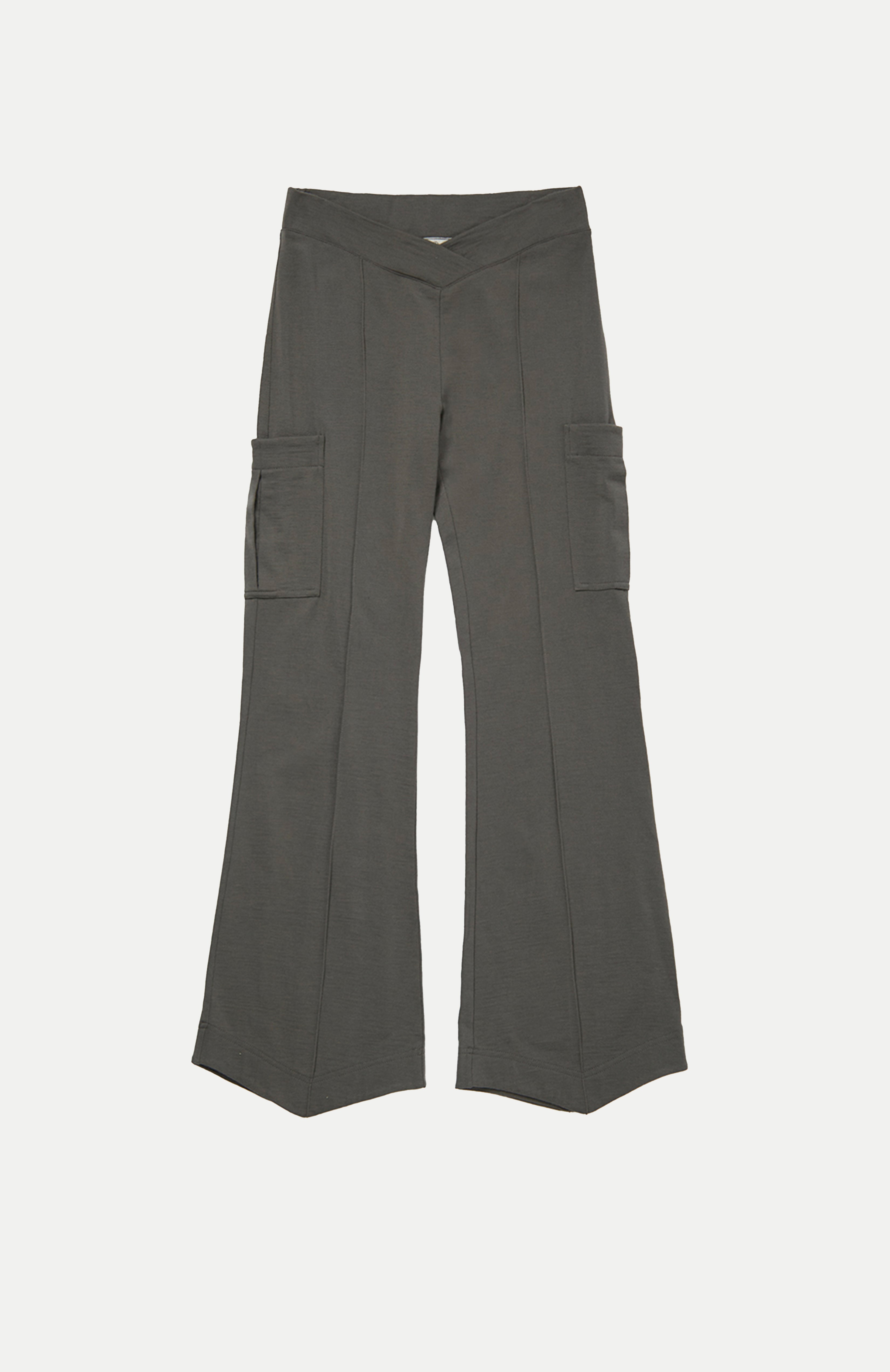 Relaxed cargo track pant with a V-shaped elasticated waist. 3D saddle pockets positioned on the side of the leg and back patch pockets for extra added storage. Finished with a flared leg and shaped hem.