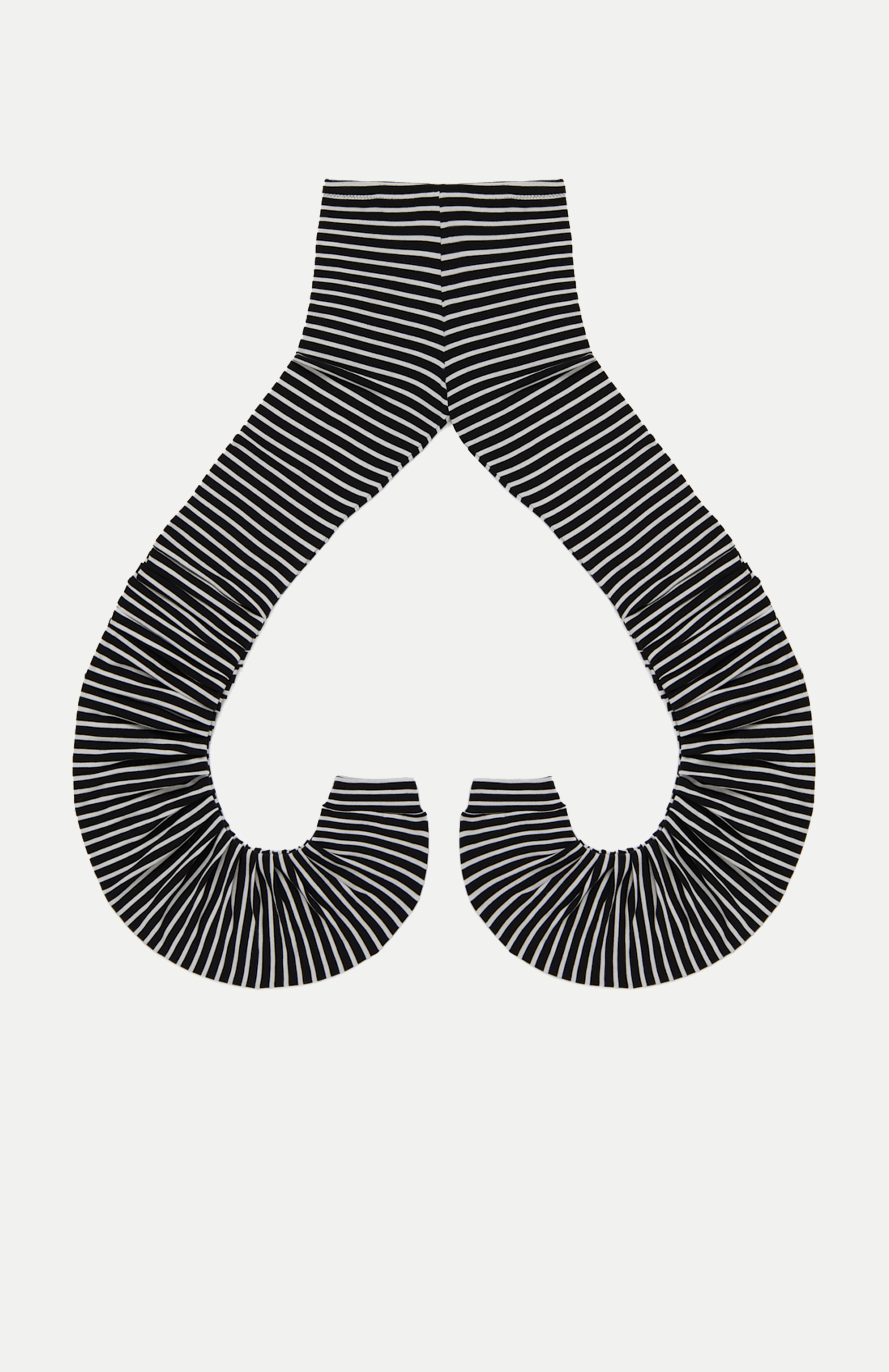High rise monochrome stripe leggings with a pleated inseam. Volume starts from the knee and drapes down over the foot for a lamb leg effect.