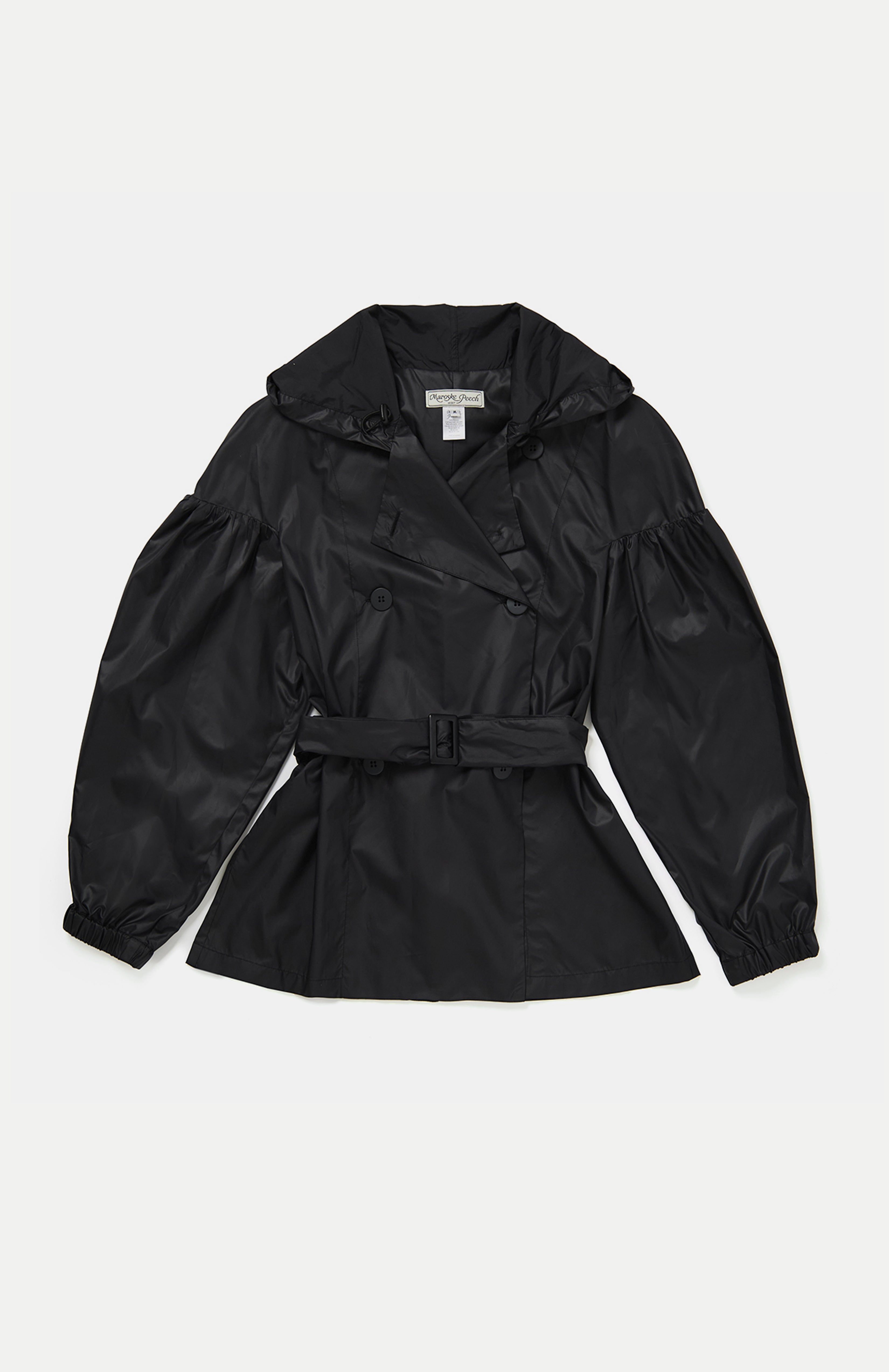 Lightweight double breasted trench jacket with dramatic gathered sleeves. Adjustable pull string hood and elasticated cuffs. Side seam pockets and belt loops. Comes with waist belt fastener.