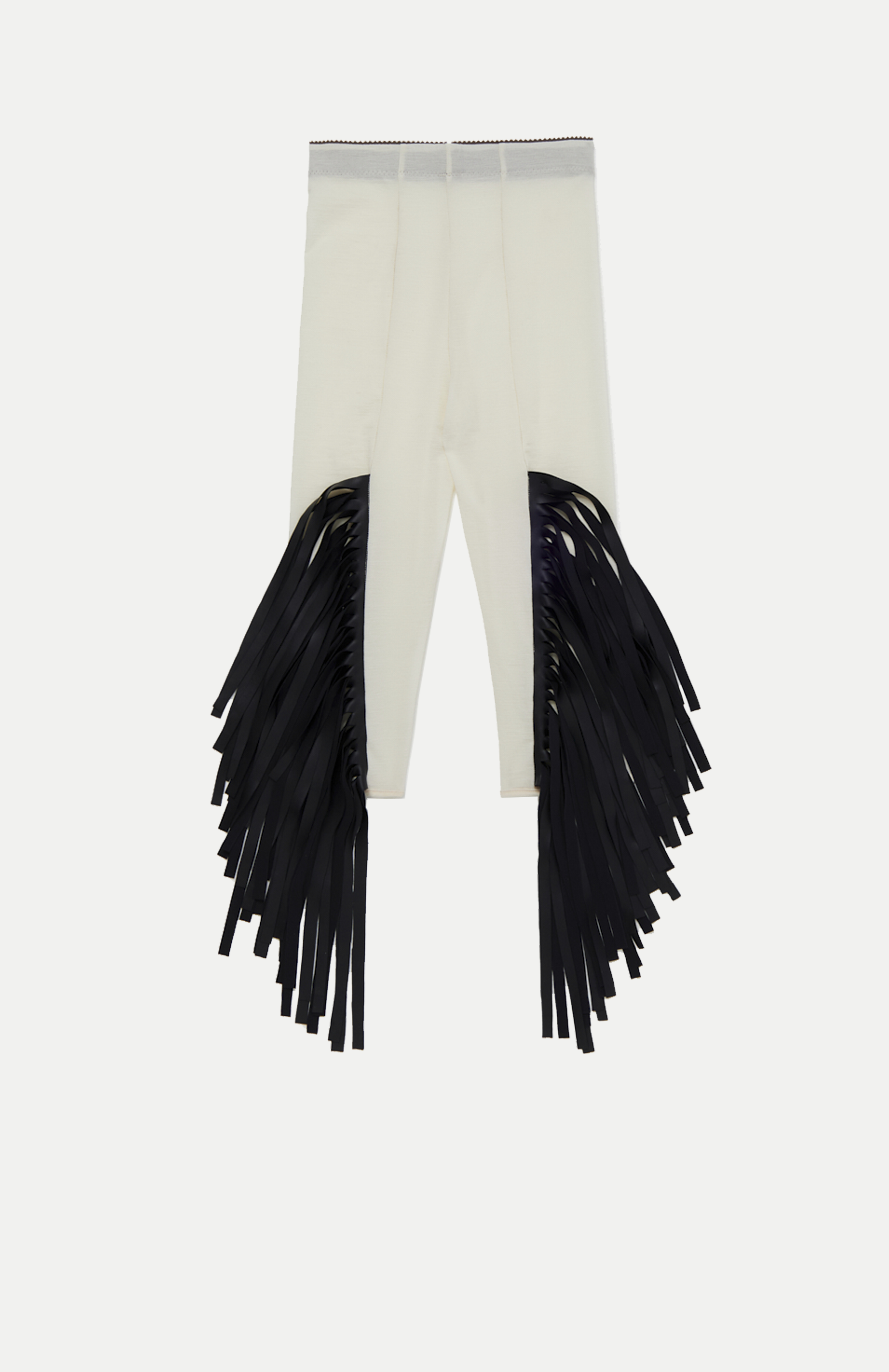 High rise natural wool tights with a double layered hand cut black fringing inserted into the back leg seam. Fringing is designed to fall from the upper thigh for a flattering finish. This style is perfect for show ponies.