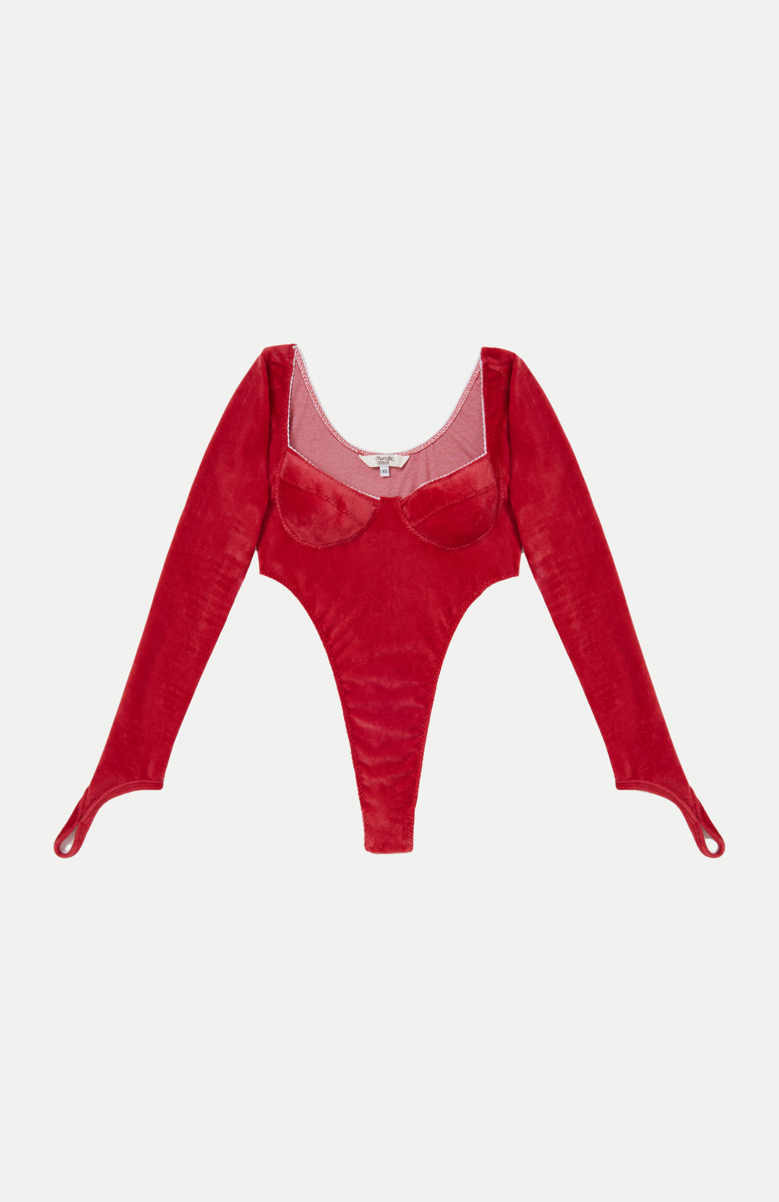 A romantic reprise of our signature high cut Geotard in red velour. Features, zig-zag decorative stitching on a scalloped white elastic, a fully lined gusset and finger stirrups.