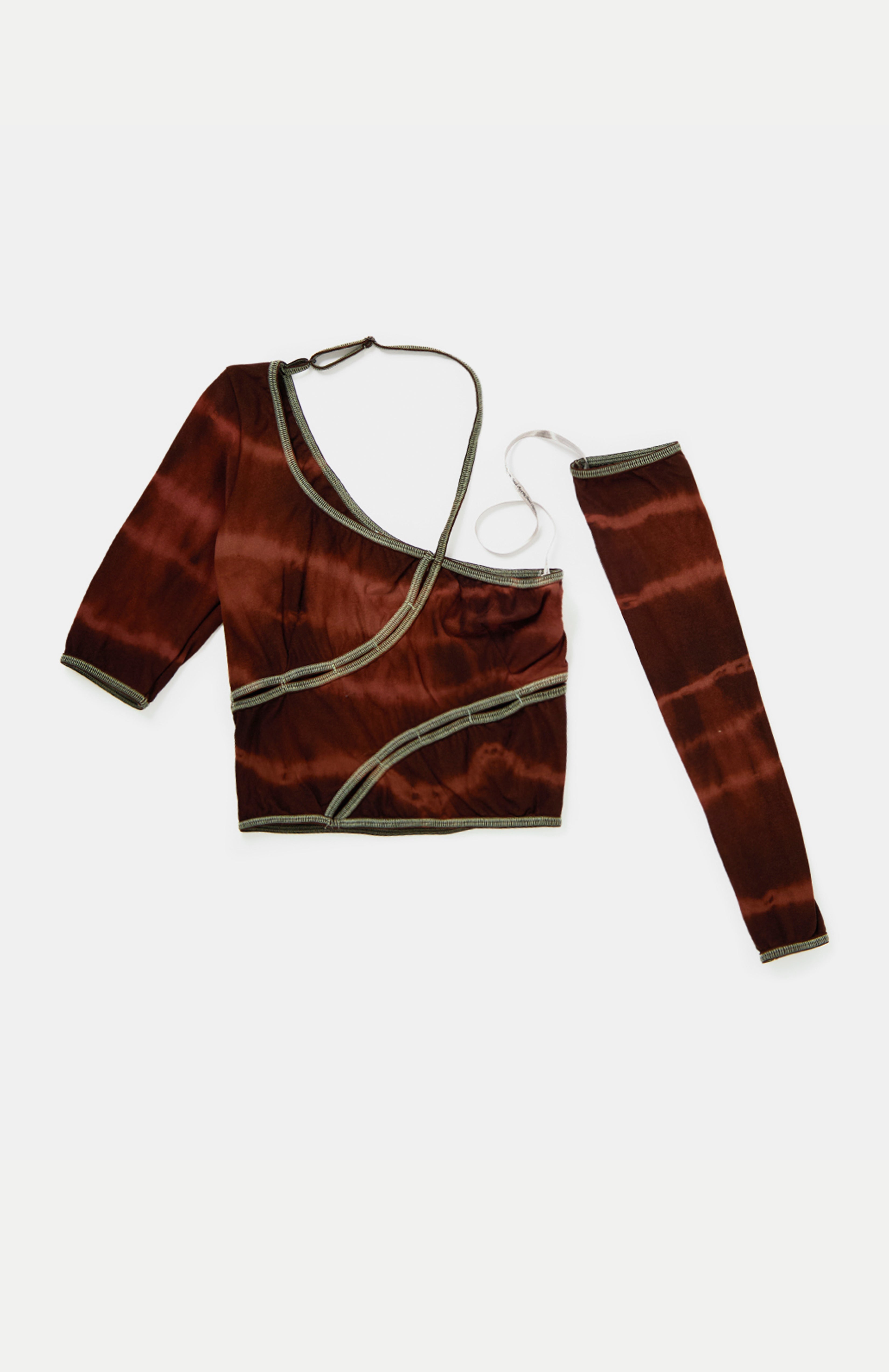 Irregular bar-tacks hold panels together, creating a bewitching peek-a-boo effect. Includes a separate sleeve attached with hanger tape for styling options. Each garment has been hand tie dyed in an outdoor dye bath over a wood fire, placed perfectly under a lemon tree.