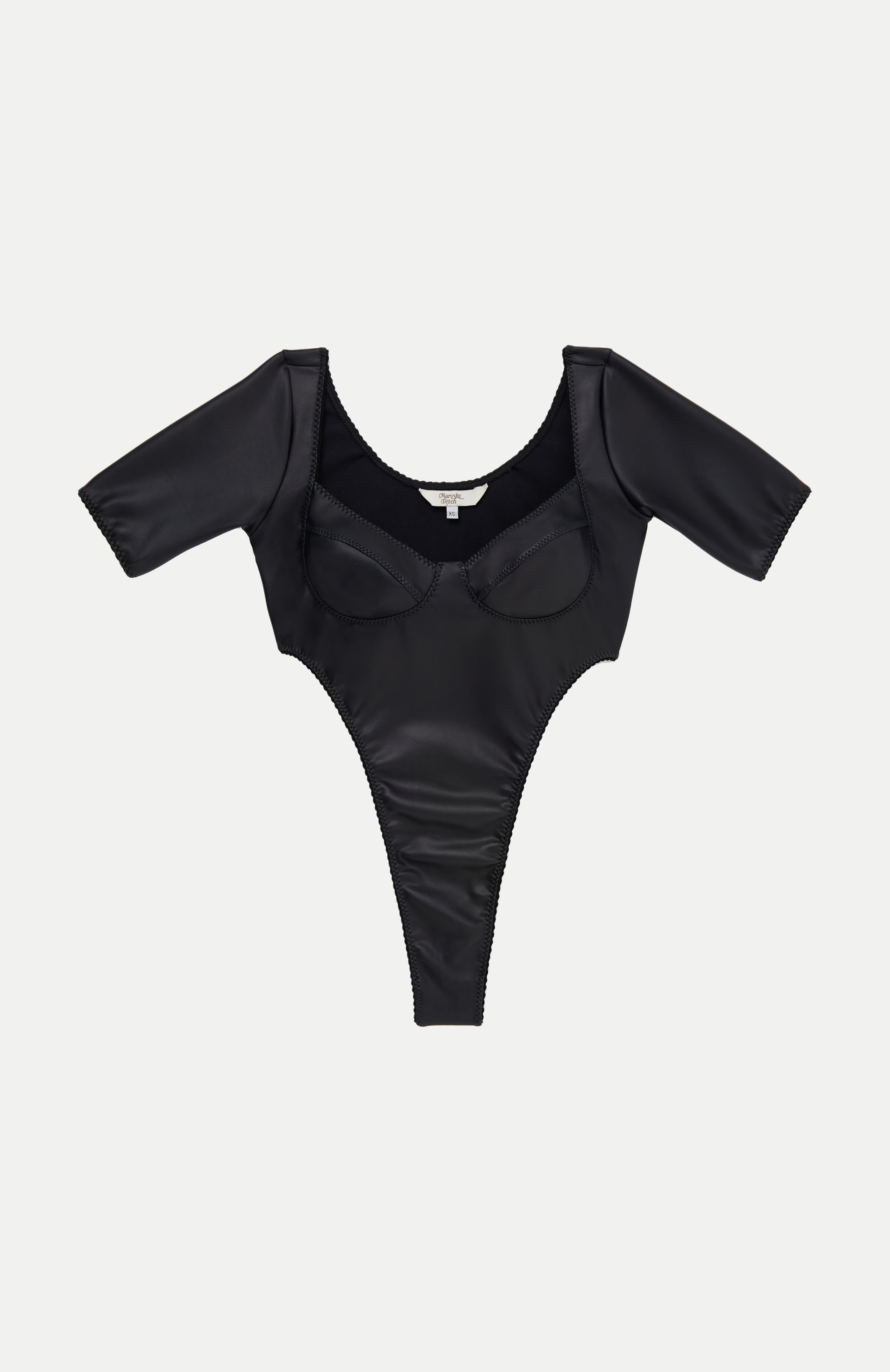 A reprise of our signature high cut Geotard in deadstock wet look coated ponte. Features, zig-zag decorative stitching on a scalloped black elastic, a fully lined gusset and cap sleeve