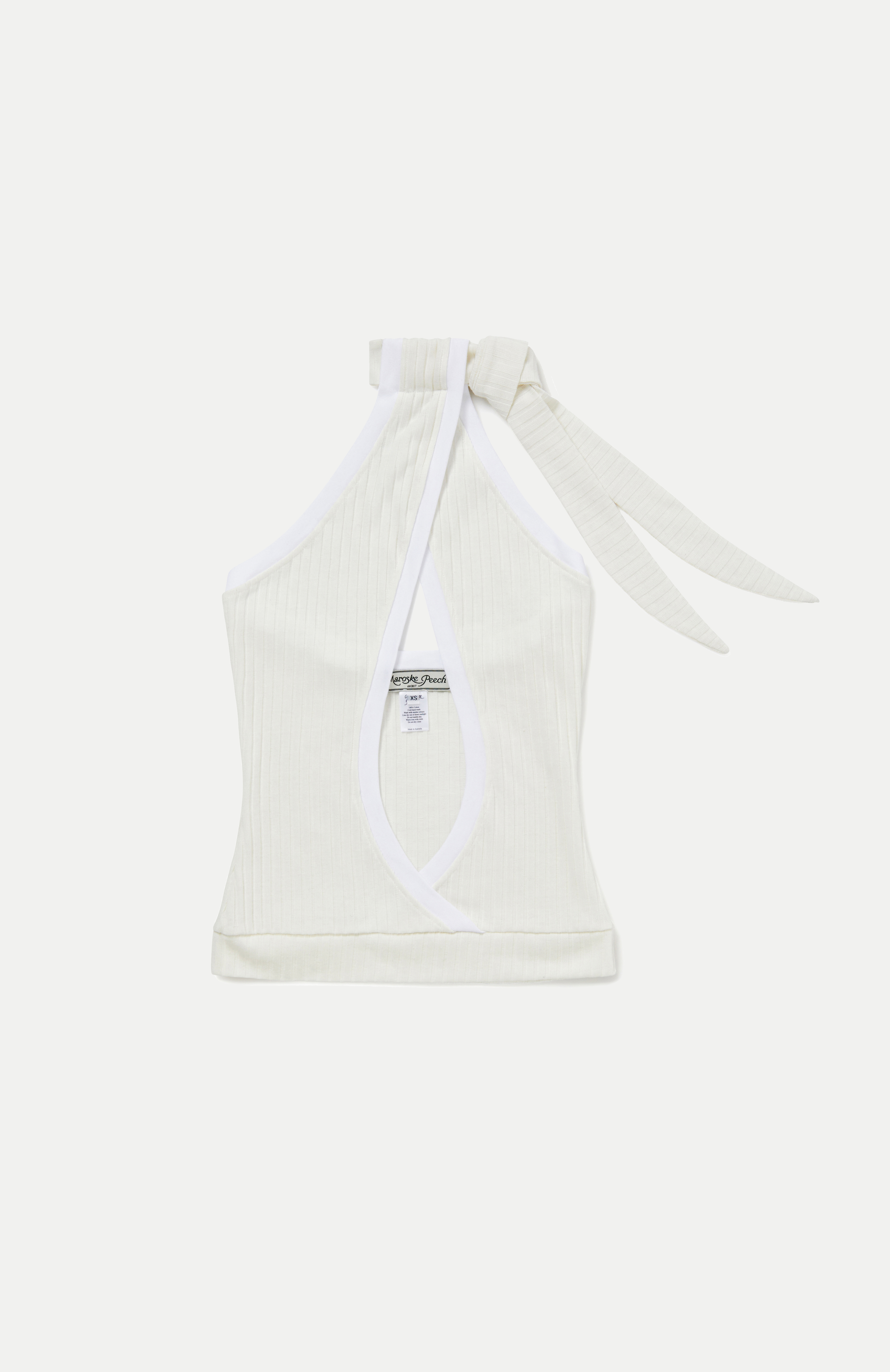 A simplistic plunge halter top with an adjustable neck tie in a white cotton rib. Creates an effortless glamorous neckline favoured among the golden era of Hollywood starlets. Matches well with jeans, the Maroske Peech Bubble skirt or Gathered Leggings.