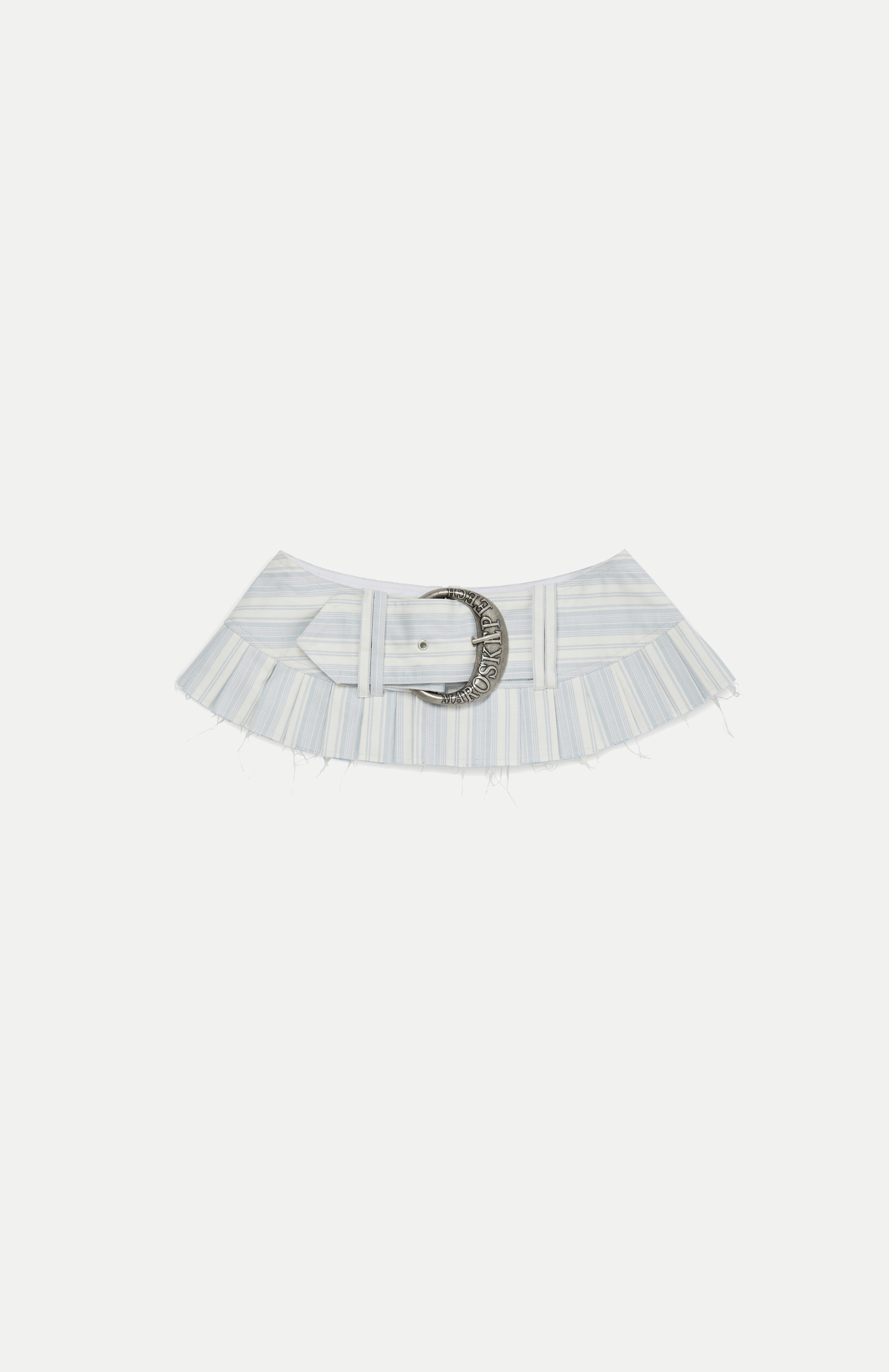 Pleated belt that is slashed at the hem, a signature centre front Maroske Peech branded D buckle holds the belt closed with three adjustable eyelet sizes settings.
