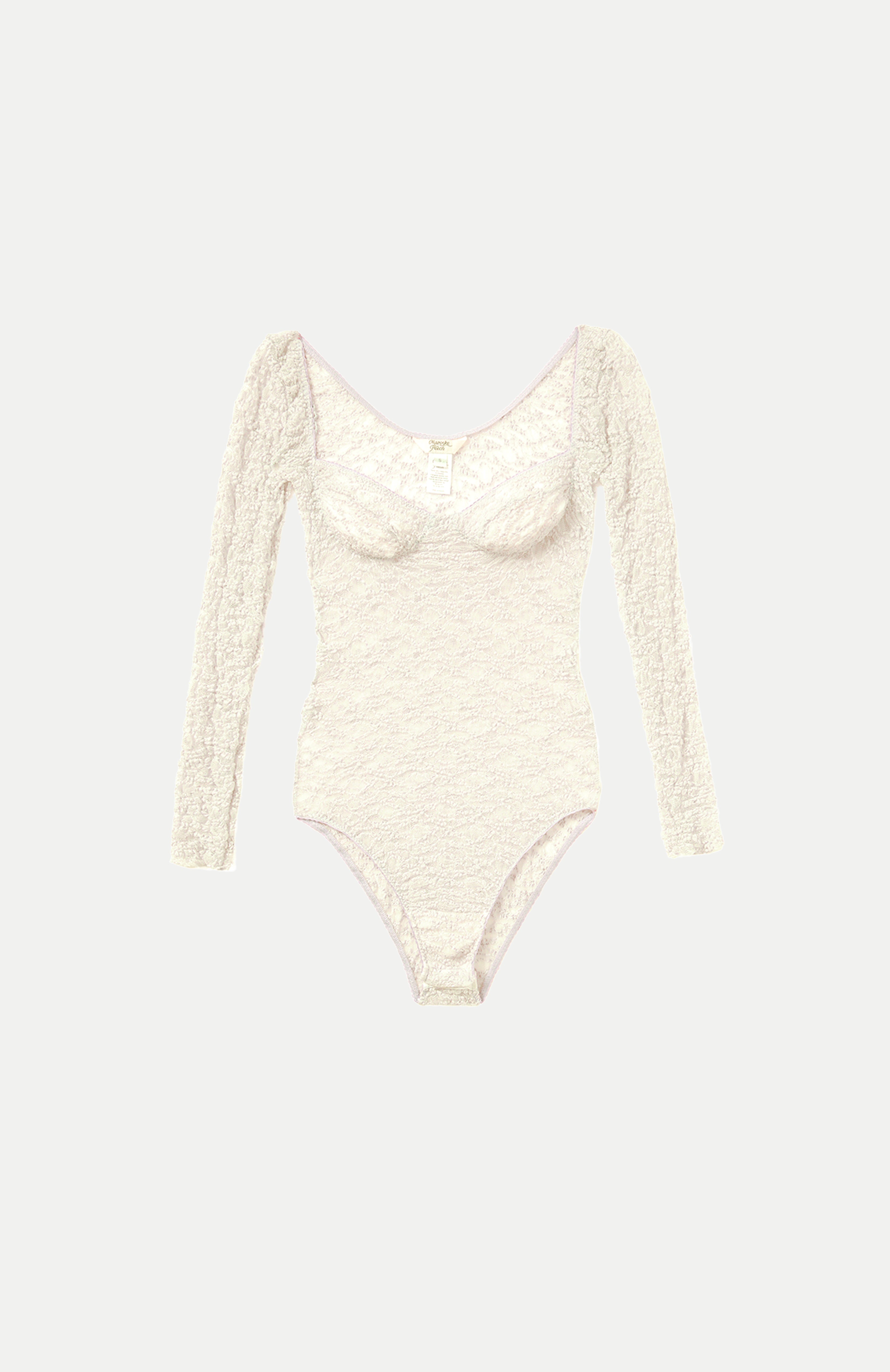 Maroske Peech A reprise of our signature stretch soft cup leotard in stunning ivory lace. Features a snap opening at gusset for ease wearer and zig-zag decorative stitching with a scalloped elastic detail.