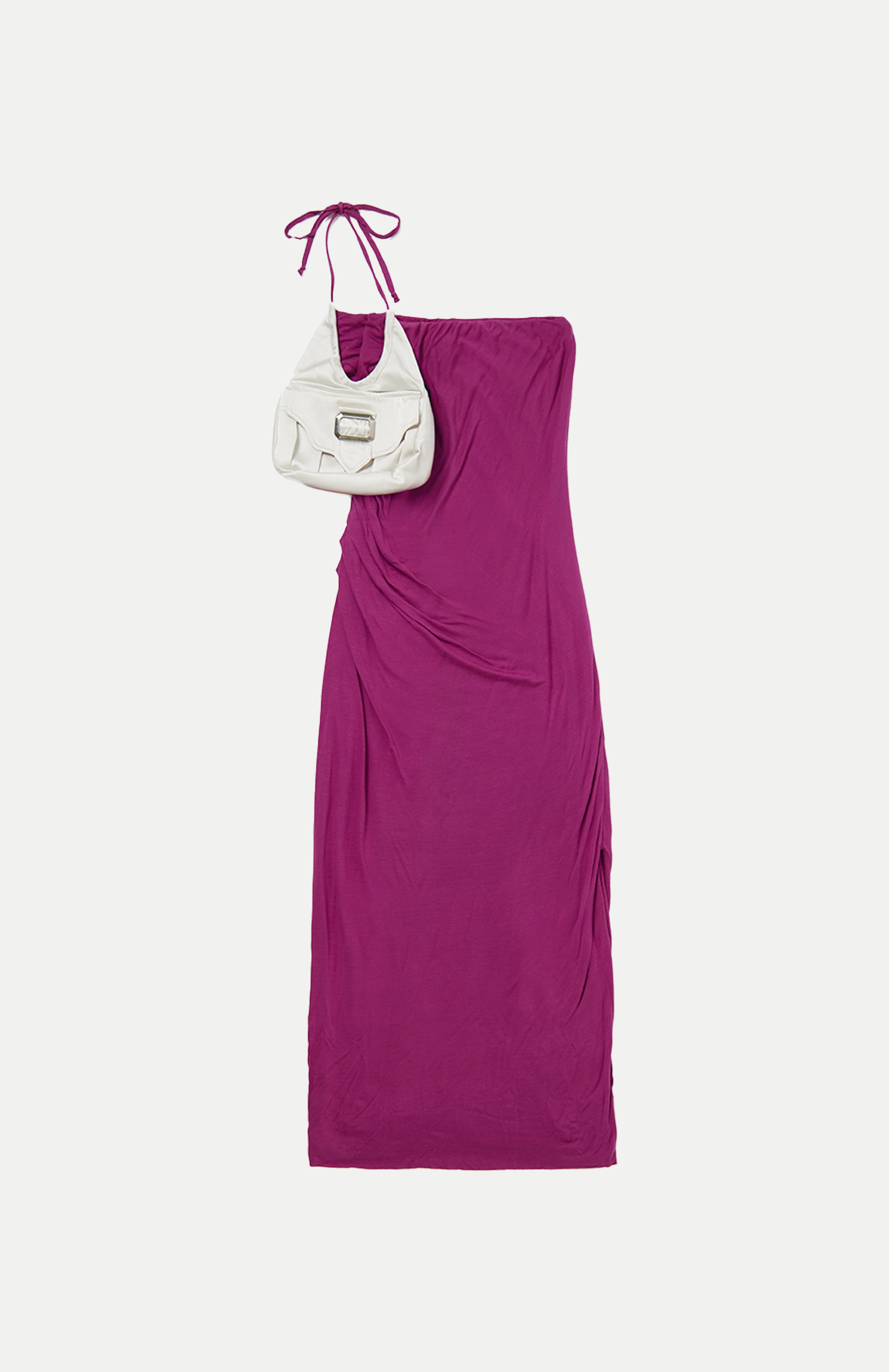 Mid length maxi dress in fuchsia jersey with attached Navy purse pocket. Features, flattering pleats from underarm to the high hip Thigh high slit and adjustable tie spaghetti strap. fully lined with square buckle and magnetic button.